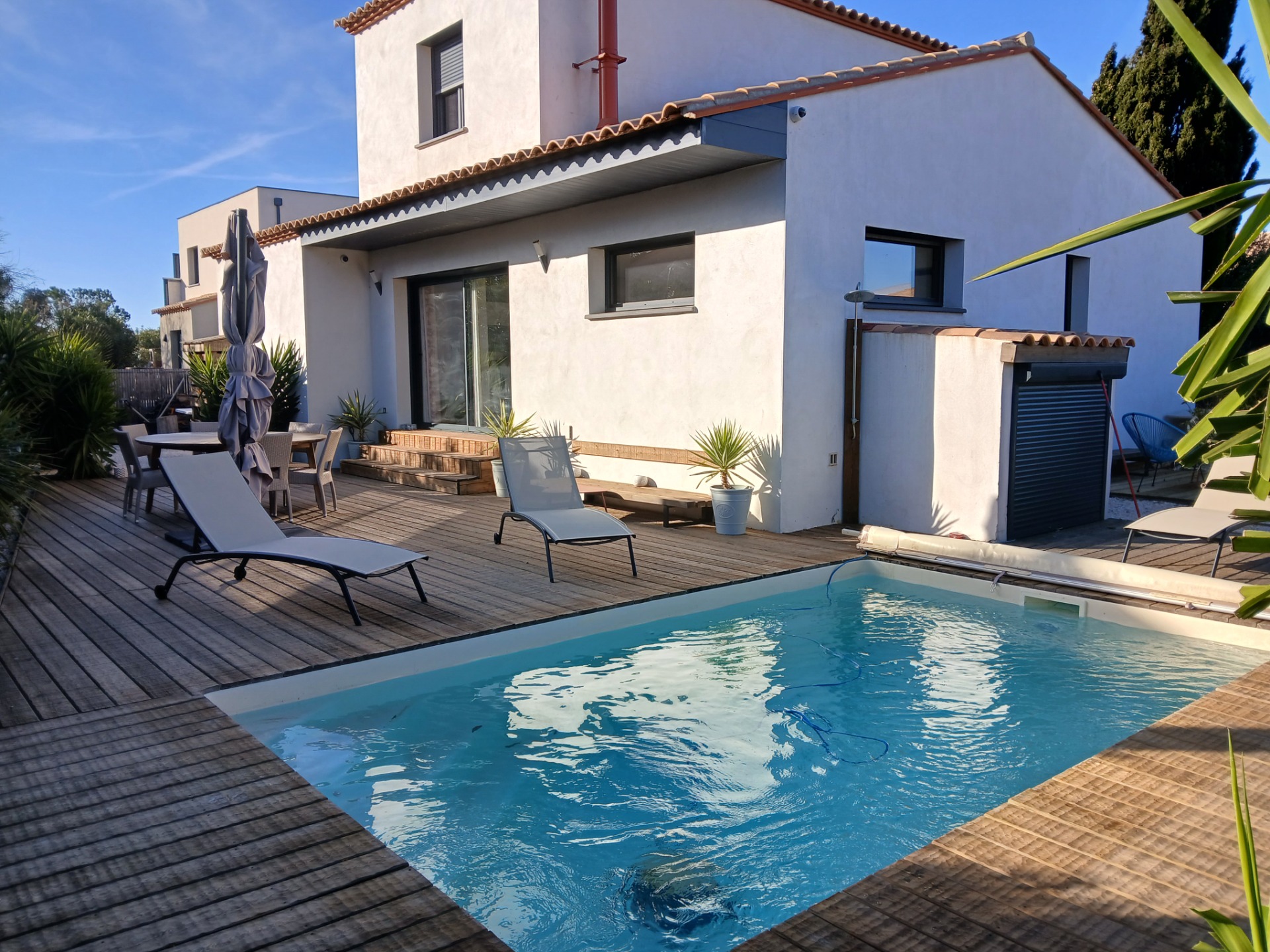 Côté extérieur : table à manger, chaises de jardin, plancha, une grande terrasse en bois sur l'arrière de la maison avec accès à la piscine (chauffée avec volet roulant électrique), une petite terrasse en bois sur le côté qui permet d'être à l'ombre le soir. Petit salon de jardin et bains de soleil.
